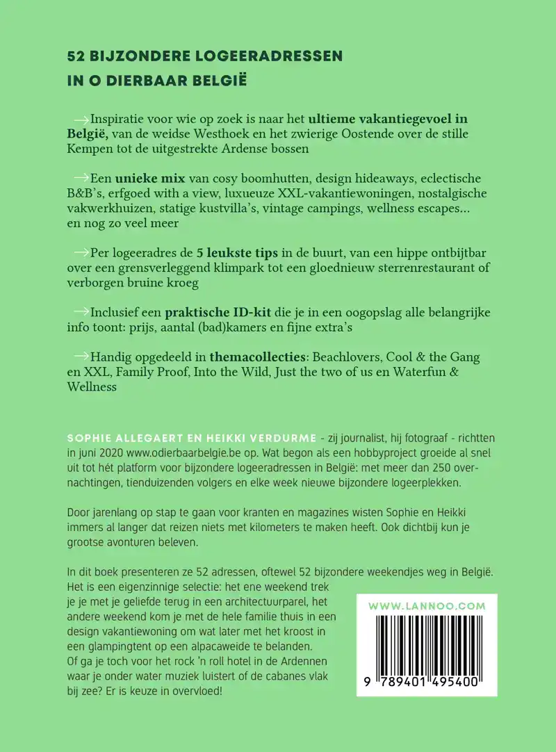 In dit boek presenteren ze 52 adressen, oftewel 52 bijzondere weekendjes weg in Belgie. Het is een eigenzinnige selectie: het ene weekend trek je je met je geliefde terug in een architectuurparel, het andere weekend kom je met de hele familie thuis in een design vakantiewoning om wat later met het kroost in een glampingtent op een alpacaweide te belanden. Of ga je toch voor het rock ''n roll hotel in de Ardennen waar je onder water muziek luistert of de cabanes vlak bij zee?